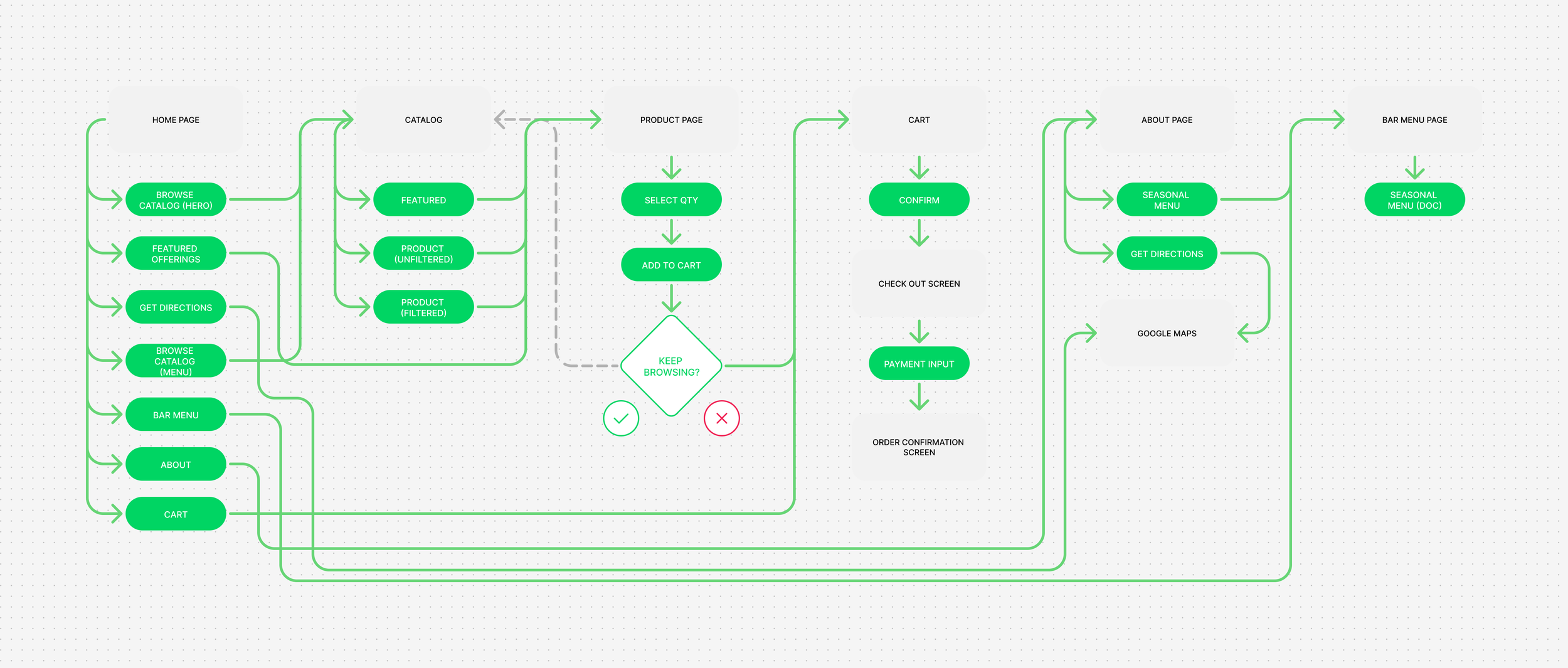 Based on our key concepts, we began with a foundational user flow to visualize how a user would navigate the new website. The user flow diagram illustrates the path a customer might take, from the homepage all the way through to placing an order.